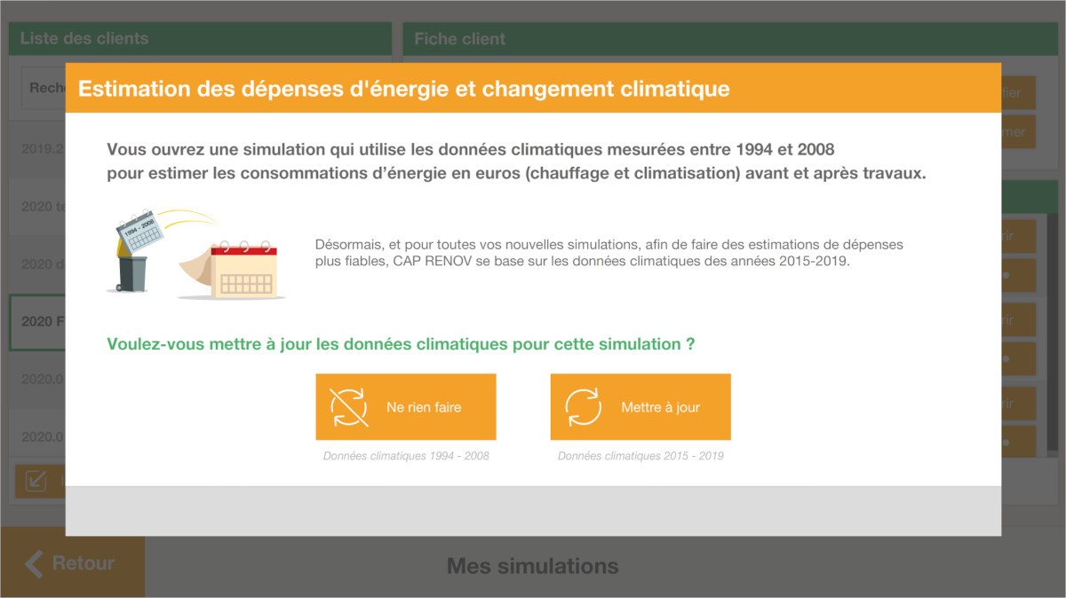 Au rechargement d’une ancienne simulation, CAP RENOV+ vous propose de rester sur les données climatiques de la 3CL ou bien de mettre à jour la simulation avec les données climatiques 2015-2019 afin d’améliorer l’estimation des dépenses.